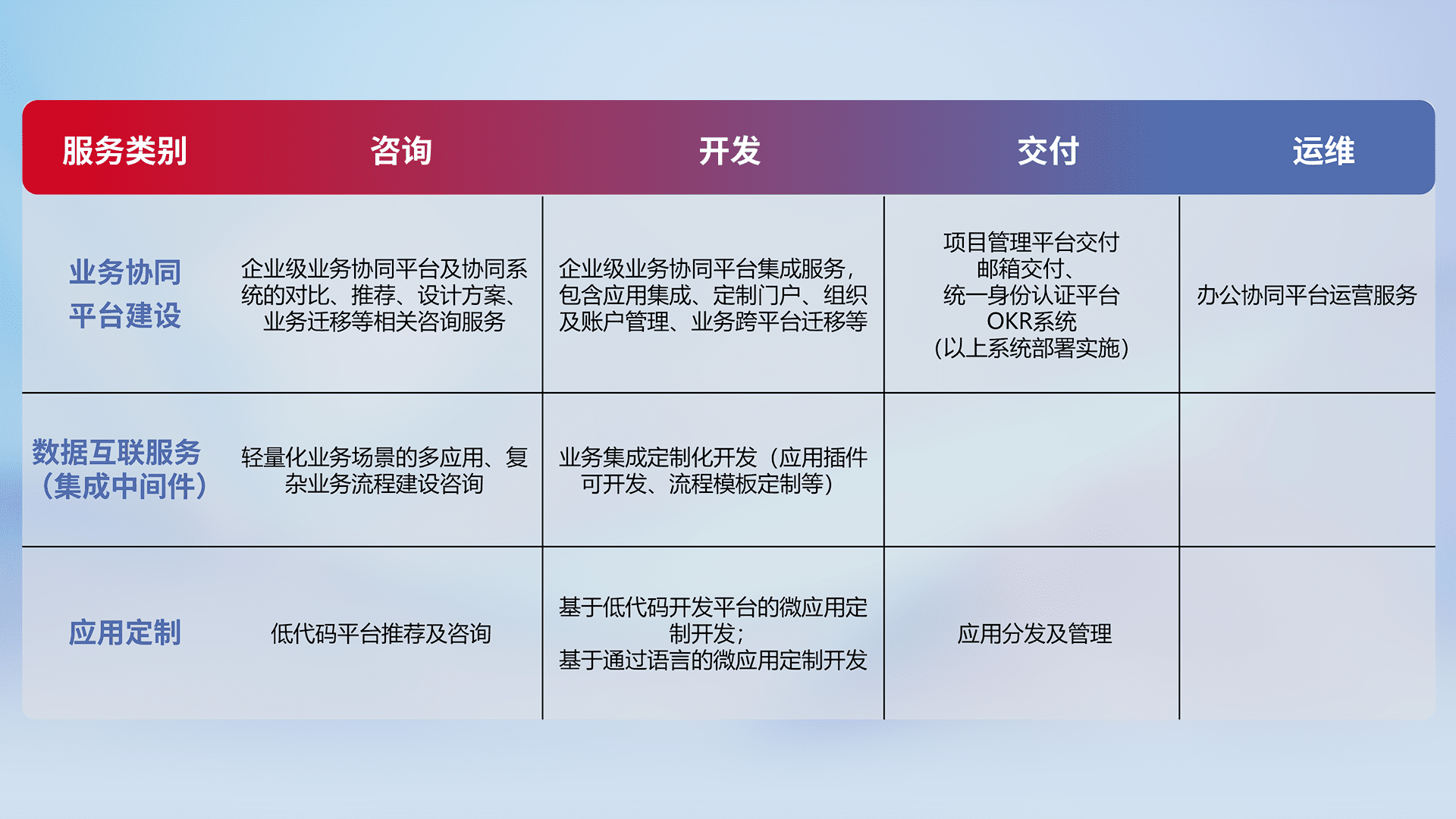 针对钉钉、、、、企微、、、、IDaas等平台级产品提供产品的规划、、、、方案、、交付、、、、定制化开发等服务,,,实现如统一协同办公、、智能客户服务、、、混合会议管理、、智能数据查询、、、、等业务场景,,实现数字化转型。。。。